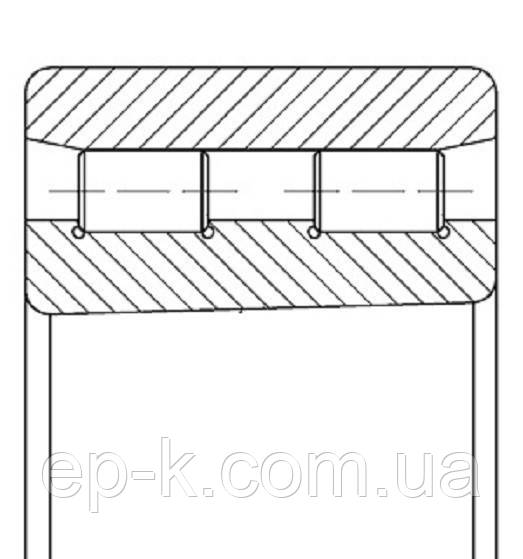 · NN — зовнішнє кільце з трьома бортами. Ролики утримуються латунним сепаратором із шаховим розташуванням гнізд. Кільцева канавка та змащувальні отвори на зовнішньому кільці